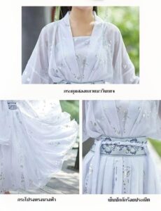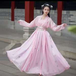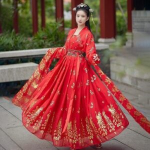 This four-piece red Hanfu set consists of a wide-sleeved robe, a waist-length skirt, a shawl, and a sash. The main skirt is made of deep crimson satin, its color rich and full, like solidified cinnabar. The wide-sleeved robe is embroidered with gold thread intricate floral patterns, the sleeves three feet wide, flowing gracefully like unfolding clouds. The shawl drapes lightly, swaying in the wind, adding a touch of ethereal beauty. The sash cinches the waist, outlining a graceful figure. The entire set is meticulously crafted, with a harmonious blend of red and gold, exuding festive elegance, making it especially suitable for important occasions such as weddings and coming-of-age ceremonies.